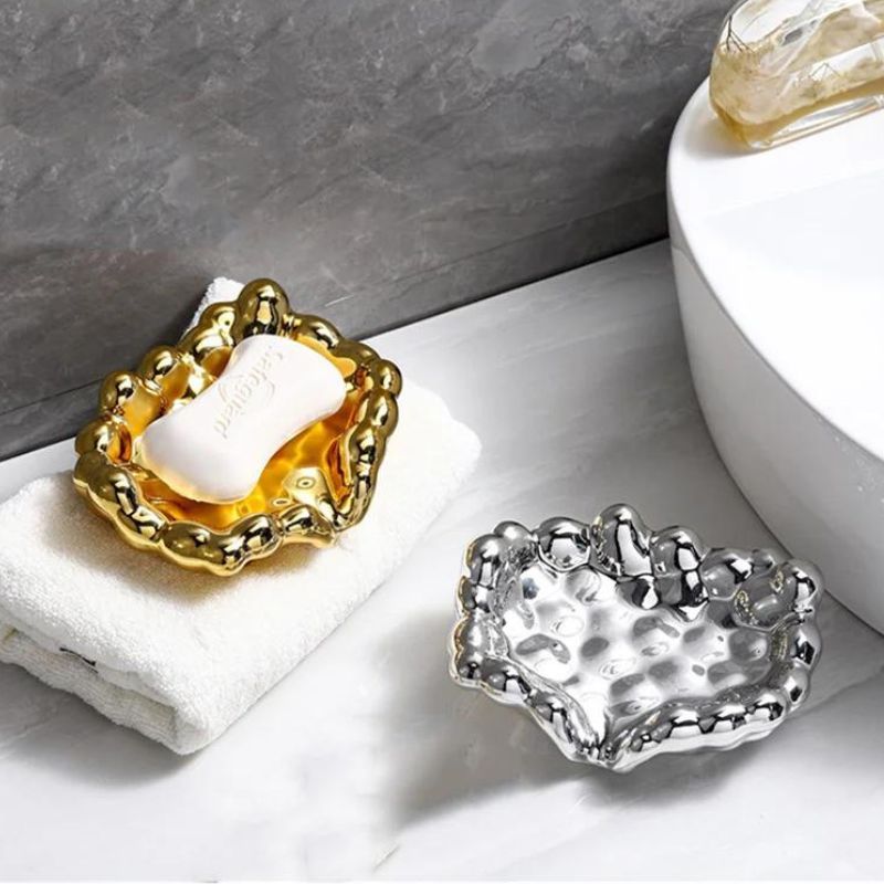 Zaprojektowana z myślą o miłośnikach pięknych przedmiotów, ta złota mydelniczka zaskakuje swoim organicznym, falistym kształtem, który przywodzi na myśl delikatną chmurę lub płynną formę. Wykonana z wysokiej jakości ceramiki i pokryta lśniącą, złotą powłoką, łączy w sobie trwałość z niezrównanym wyglądem. Jej unikalne zagłębienia nie tylko pięknie wyglądają, ale także praktycznie utrzymują mydło w suchości, zapobiegając jego rozmiękczaniu. Dodaj odrobinę glamouru do swojej codziennej rutyny i ciesz się przedmiotem, który jest równie praktyczny, co dekoracyjny.
